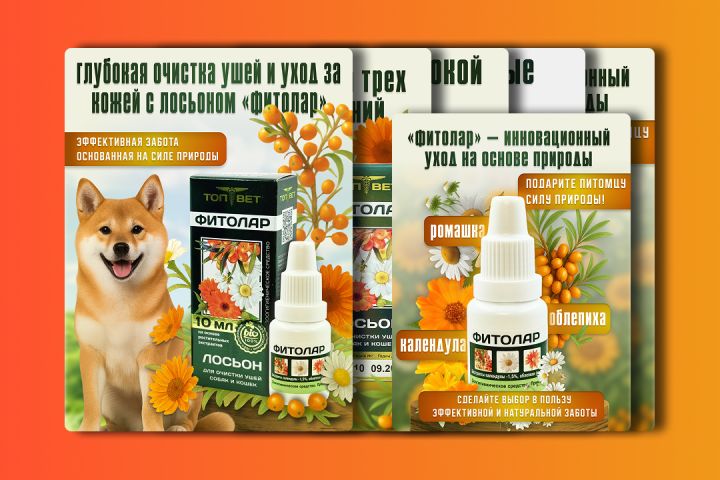 В результате получился единый визуальный комплект из пяти инфографических слайдов для продвижения ветеринарного лосьона «Фитолар».