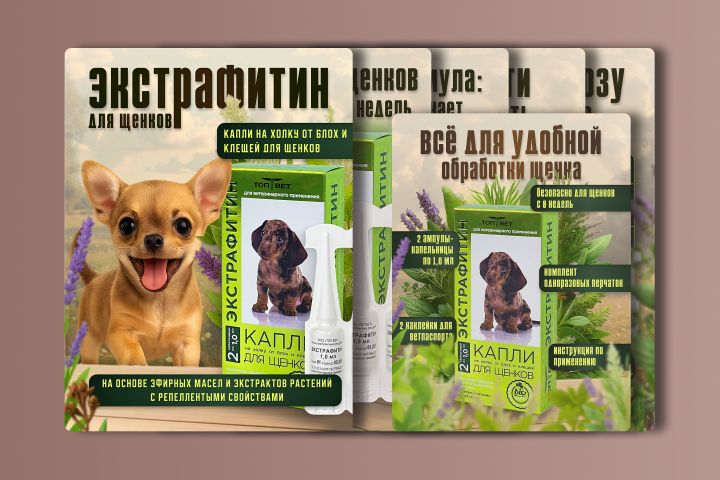 Клиент поставил задачу разработать инфографику из 6 слайдов для ветеринарного препарата «Экстрафитин для щенков», направленного на защиту молодых собак от блох и клещей.