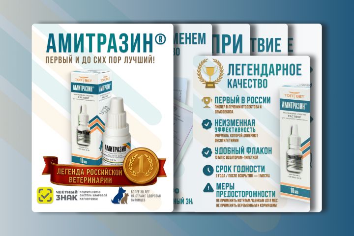 Клиент поставил задачу разработать серию из 5 инфографических слайдов для легендарного ветеринарного препарата «Амитразин®», первого российского средства против ушного клеща и демодекоза.