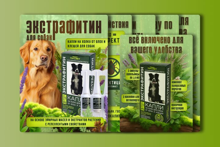 Клиент — компания «ТопВет», производитель ветеринарных препаратов и зоокосметики, — поставил задачу создать инфографику из 5 слайдов для препарата «Экстрафитин», предназначенного для защиты собак от блох и клещей.
