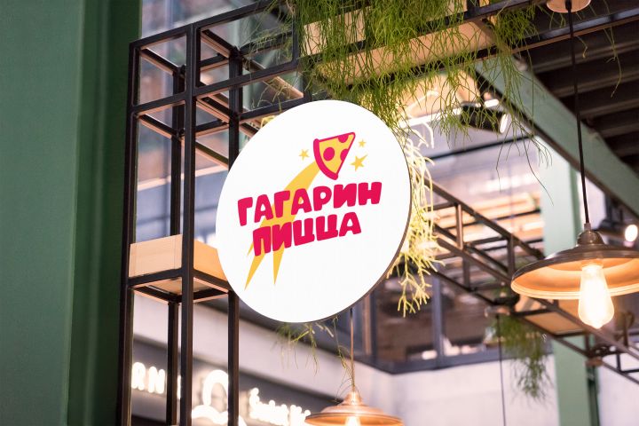 Логотип с названием "Гагарин пицца" говорит сам за себя. В знаке показана ракета в виде пиццы, и графический элемент звездного конца, который добавляет логотипу нужную динамику