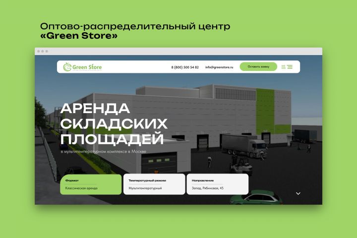 Клиент - крупный складской оптовый комплекс, предлагающий холодильные и морозильные склады, производственные площади, офисы в аренду. Задача была: показать масштаб, преимущества, обеспечить, чтобы потенциальные арендаторы могли быстро сориентироваться по видам площадей, условиям, преимуществам, контактам.