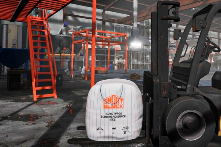 Были смоделированы все элементы производственной линии: загрузочная установка, трубы, сборники сырья, колонны вспенивания, мешалки, конвейеры и формы для блоков. Вся среда — полностью фотореалистичная, с правдоподобным освещением, текстурами и эффектами пара, пыли и звуков оборудования.
