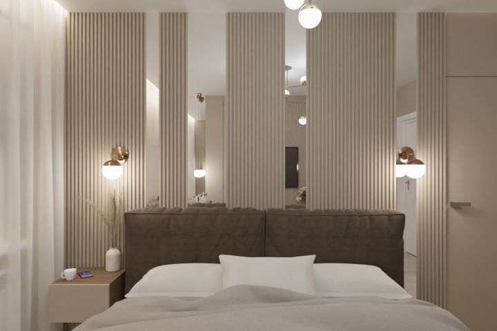 Изначально само помещение является мансардным, но за счет возведения перегородки мы отделили гардеробную в той части, где потолок идет под скос.