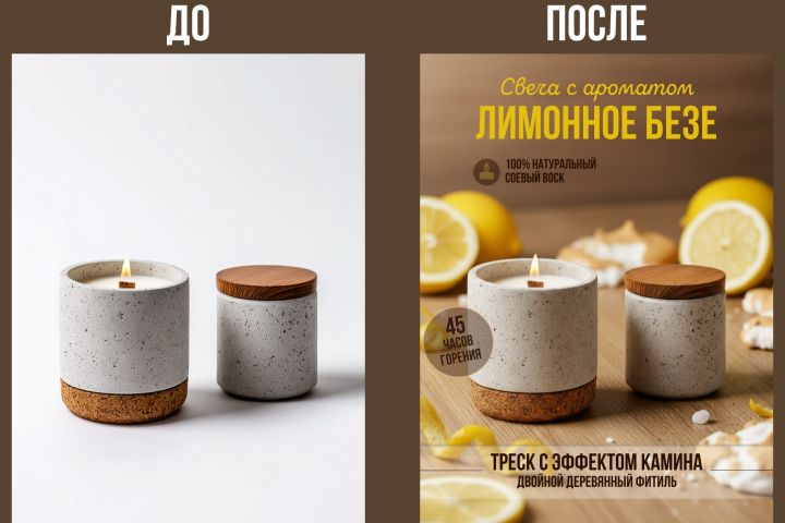 Карточка товара превратилась в законченный визуальный продукт, где все элементы работают в единой стилистике бренда. Благодаря тщательно продуманной иерархии, взгляд покупателя теперь цепляется за ключевые преимущества (натуральный состав, долгое горение, стильный дизайн), а не утопает в сплошном тексте. Инфографика делает акцент на выгодах, а не просто перечисляет характеристики.