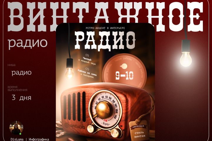 Лампочка выступает в роли тепла, её тёплый свет создаёт уют, теплоту и нежность. Внешний вид самого радио очень стильный. Здесь нужно было лишь немного добавить цвета и магия сама заработала. Старинная ручка и печать - передают старину.