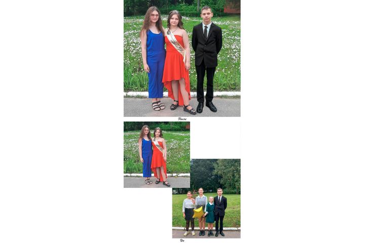 Улучшение фото, создание коллажа (вырезать фото мальчика, поставить на фото с девочками), добавить тень, нарастить фон, центрировать фигуры