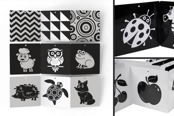 Черно-белые развивающие карточки для детей первого года жизни 0+. Разработка персонажей и узоров.
