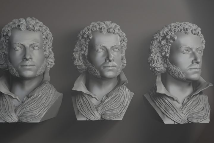 3D-модель Пушкина выполнена в стиле классического бюста и предназначена для печати на фотополимерном 3D-принтере. Количество треугольников - 957318, высотой почти 15 см, она передает выразительные черты, характерные морщины и аккуратные кудри, выполненные с высокой детализацией