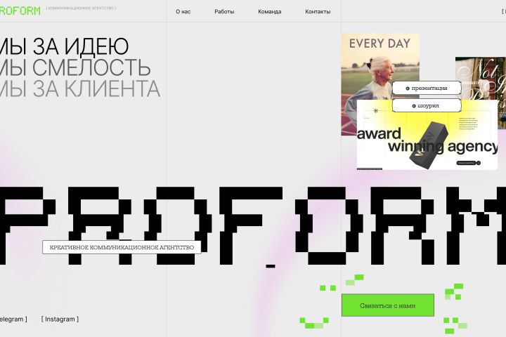 Создать нетиповой сайт для креативного агентства, который запоминается с первого экрана и вызывает доверие через дерзкую, но продуманную подачу.