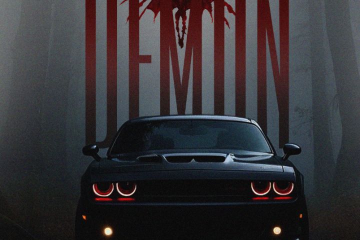 Нужен постер, который передавал бы всю мощь и харизму Dodge Challenger. Хочу, чтобы постер был выполнен в мрачной, но стильной эстетике, с акцентом на агрессивном дизайне автомобиля и демоническом символизме. Важно, чтобы постер создавал ощущение силы и эксклюзивности. Информация об истории модели была бы приятным дополнением.