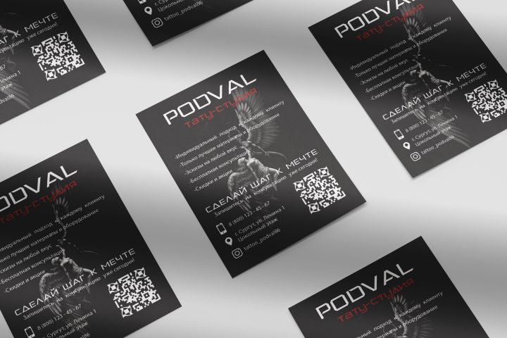 Создать рекламный флаер для тату-студии "PODVAL", который будет привлекать потенциальных клиентов информировать о ключевых преимуществах и побуждать к действию. Флаер должен выделяться среди другой рекламной информации и вызывать интерес к услугам тату-студии.