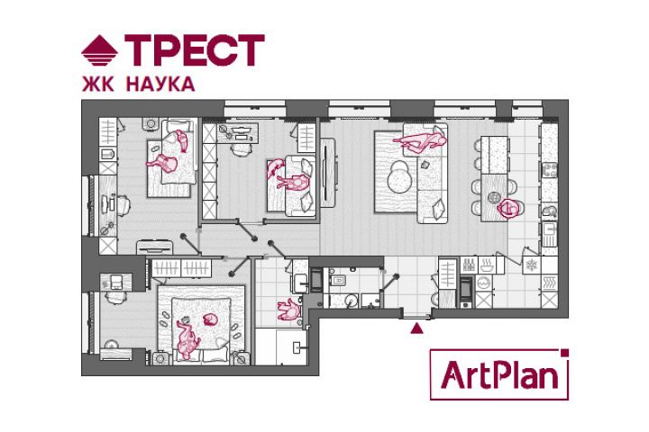 Вариант с высокой детализацией планов квартир для застройщика ТРЕСТ на примере квартиры в ЖК Наука