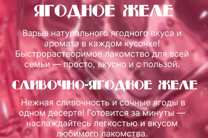 Создайте 2 красивых, сочных, вкусных описания для продуктов " Ягодное желе" и "Сливочно-ягодное желе"