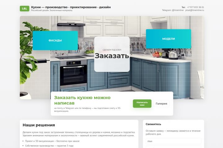 Создать эффективный лендинг для производителя кухонь, который демонстрирует услуги компании и побуждает посетителя оставить заявку. Ключевые требования: сильное первое впечатление, понятное представление услуг, простота связи и адаптация под разные устройства.