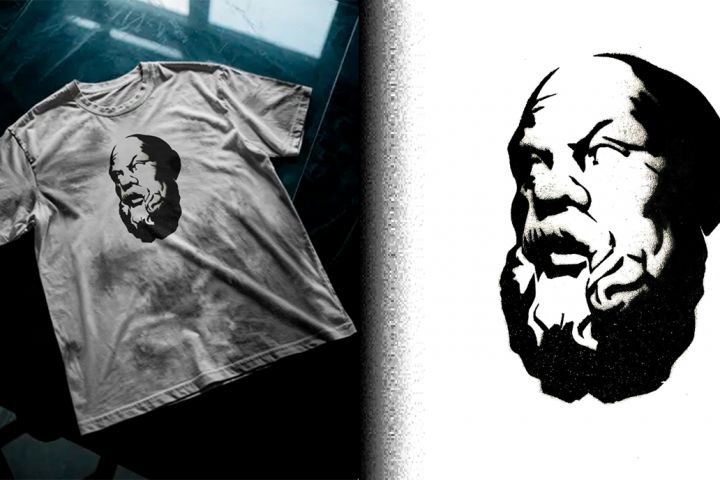 Существующую 3д модель Сократа отрендерил с жестким светом, затем доработал в фотошопе. Цель была сделать трафарет для переноса на футболку спрей-краской. Античный философ переосмыслен в уличном стиле