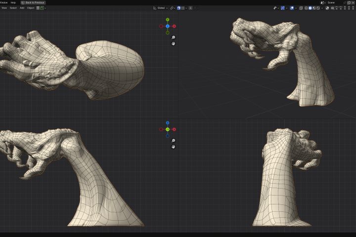 Была идея сделать руку монстра для интерьера. Модель размером 1к1, поэтому печаталась двумя частями. Также в этой работе попробовал себя в ретопологии (чистая сетка).