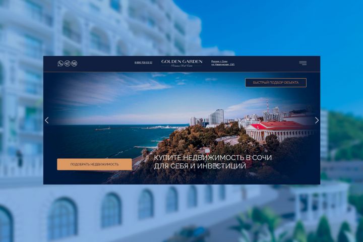 Разработан имиджевый сайт с индивидуальным дизайном и сборкой на WordPress / Woocommerce. В основе концепции заложен строгий лаконичный стиль, отражающий специфику проекта — работу с premium сегментом в недвижимости. Основные цвета: тёмно-синий и золото. Дополнительные: беж и светло-серый.