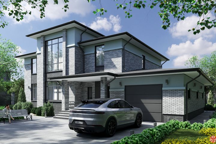 - моделирование окружающего пространства: все что изображено на рендерах вокруг дома - это целиком и полностью вымысел визуализатора в границах реального земельного участка согласно ситуационному плану. Соседние дома показаны условно, растительность внутри и по периметру участка - условная