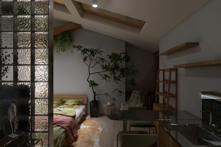 Разработать функциональный и эстетичный интерьер мансардной студии (25 м²) для молодой творческой пары, которая: