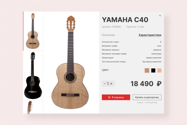 Задача: разработать карточку товара для гитарного магазина Решение: выбрана модель гитары Yamaha C40 и реализована информационная карточка товара в формате pop-up.