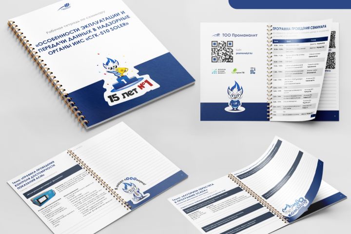 Необходимо было разработать дизайн тетради для семинара. Дано было текстовое наполнение, стикеры с фирменным персонажем и руководство по использованию фирменного стиля.
