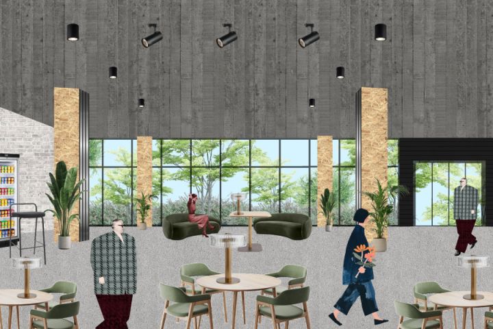 Для реализации задумки клиента, я обратился к интернету, нашел пространства подходящие под запросы заказчика, проанализировал их, собрал материалы в виде текстур, элементов интерьера, людей. После применил классические композиционные способы коллажирования.
