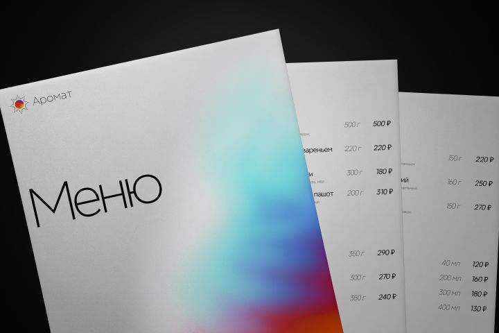 Так айдентика ресторана «Аромат» передаёт ключевую идею — каждое блюдо, как и каждый оттенок цвета, раскрывается постепенно и оставляет послевкусие.