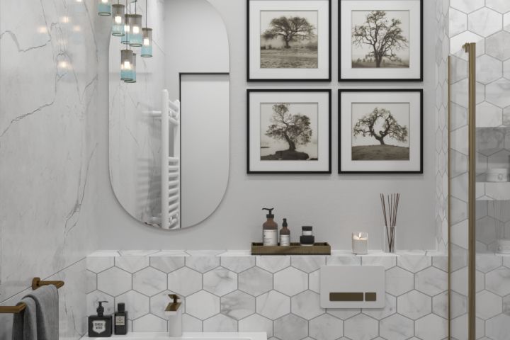Санузел выложен крупноформатным керамогранитом классического мрамора Карраро. Одна акцентная стена выделена плиткой в форме гексагона, украшена декором и необычным подвесным светильником. Металлические элементы выполнены из белого металла в сочетании латунью. Вечерняя подсветка создаёт атмосферу романтики и расслабления после трудового дня