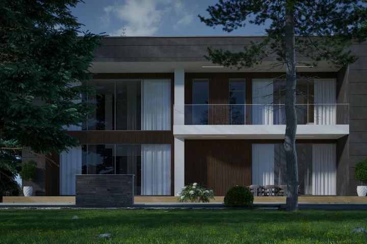 Этот проект представляет собой современный минималистичный дом, расположенный в окружении природы. Архитектура основана на гармоничном сочетании натурального дерева, бетона и стекла, что создаёт баланс между теплотой материалов и строгой современностью форм.