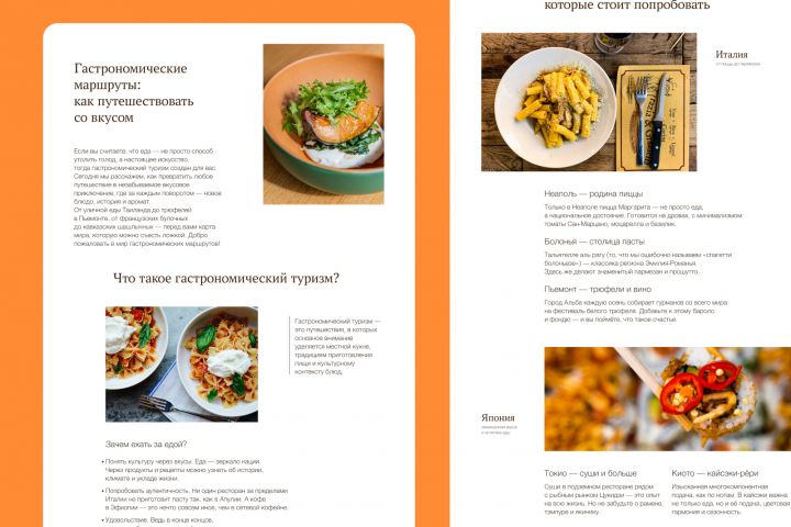Задача - создать визуально и структурно выверенный макет статьи о гастрономическом туризме, который не просто рассказывает о путешествиях и еде, а погружает пользователя в атмосферу вкусов и открытий.