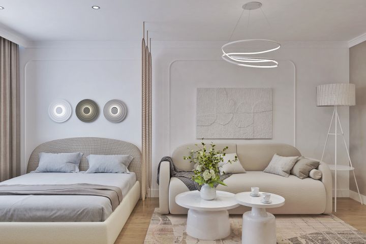 Квартира в панельном доме, 2 комнаты. Одна комната разделена на зону гостиной и спальни, другая отдана под детскую. Добились максимально удобного и красивого эффекта без перепланировки и с подбором недорогой мебели