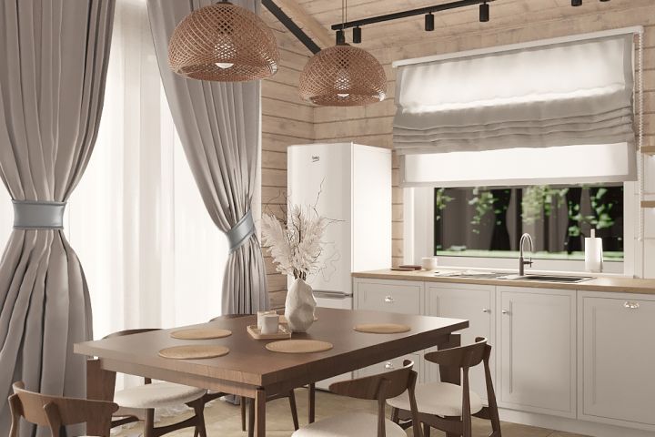 Разработано эргономичное планировочное решение, функциональная кухня с проработанным кухонным гарнитуром, техникой и расположением ящиков. Для визуального оформления выбраны светлые древесные тона, чтобы подчеркнуть воздушность и простор помещения.