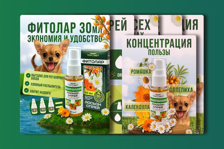 В результате получился единый визуальный комплект из пяти инфографических слайдов для продвижения ветеринарного лосьона «Фитолар».