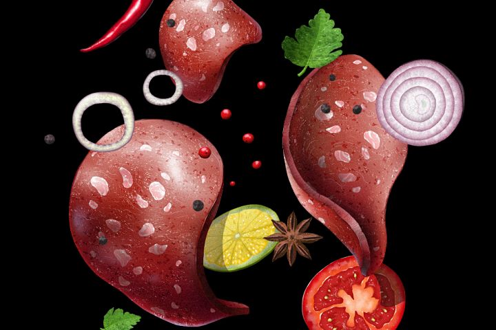 Иллюстрация с летящими продуктами: колбасой, перчиком и пряностями, выполненная в ярком и аппетитном стиле.