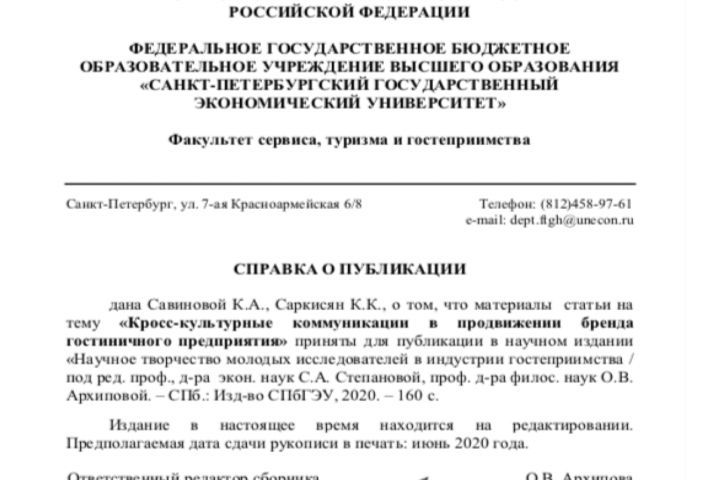 Написана и опубликована статья на тему "Кросс-культурные коммуникации в продвижении бренда гостиничного предприятия"