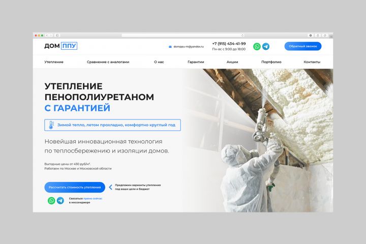 Лендинг для рекламной кампании по утеплению домов ППУ. Проект выполнен под ключ: от анализа рынка до запуска сайта. Основная задача - создать продающий лендинг, который понятно ведёт пользователя по контенту, закрывает его боли и побуждает к оставлению заявки. Сайт реализован на Tilda, адаптивный и готовый к запуску рекламных кампаний. С момента запуска проект продолжает работать успешно второй год и приносит заявки