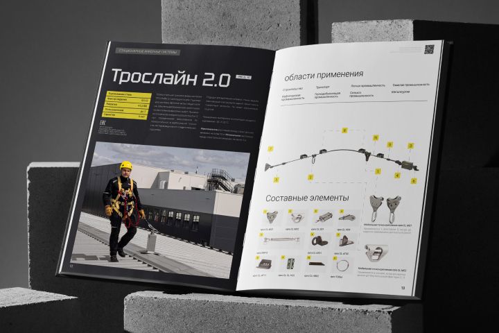 Мы разработали дизайн 48-страничного каталога формата А4 в горизонтальной ориентации. Основой стала строгая и контрастная фирменная палитра бренда — черный, желтый и графитовый серый. Была проведена большая работа по визуальному обновлению: мы заменили имиджевые фотографии на более современные и качественные, добавили детальные технические схемы, чертежи и инфографику для наглядного представления систем и их характеристик. Мы выстроили четкую логическую структуру с удобным разделением продукции, обеспечили единый стиль верстки и высокую читаемость всех материалов.