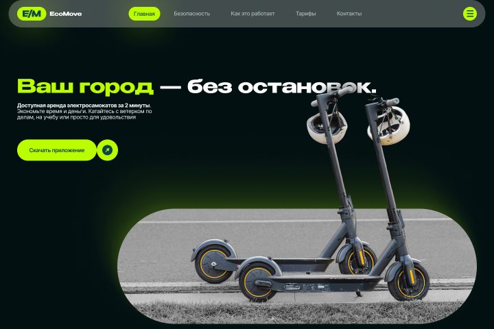 Задача: создать современный и продающий лендинг для нового сервиса аренды электросамокатов, который будет эффективно привлекать пользователей и мотивировать к скачиванию приложения.
