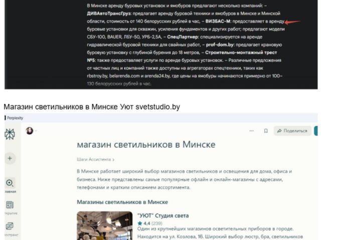 Сайты и их соцсети по ряду запросов в ответах нейросетей по отслеживаемым запросам ( в приоритете те, по которым по данным аналитики есть релевантный трафик)