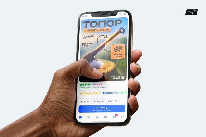 Визуал получился живым, энергичным и привлекательным, что сразу создает нужный эмоциональный отклик и передает суть продукта. Такое оформление не только выделяет топор в визуальной ленте за счет уникальной теплой палитры, но и четко коммуницирует его преимущества целевой аудитории туристов и любителей природы.