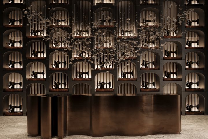 Центральный элемент — величественная стена из винтажных швейных машин, каждая из которых бережно размещена в нише с мягкой подсветкой. Они становятся символами традиций, воплощая память о ремесле и людях, создававших вещи, наполненные смыслом.