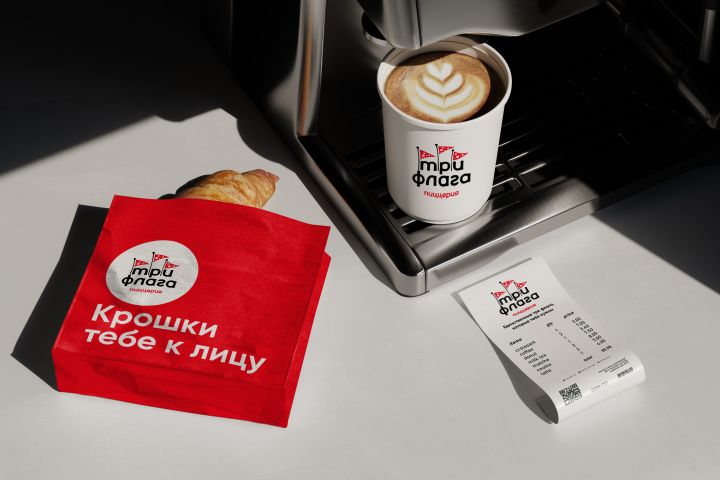 Три флага — пиццерия, куда приходят за вкусом, атмосферой и ощущением «домашнего праздника». У владельцев пиццерии уже существует дом отдыха с таким же названием, поэтому было важно сохранить узнаваемость старого бренда, но при этом перенести его смысл в новую гастро-среду, сделав образ более тёплым, легким и аппетитным.