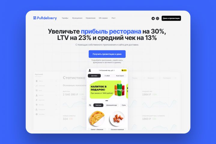 Сайт разработан для продажи собственного приложения ресторанам на доставку. Создал сайт "Под ключ" для сервиса доставки еды Pult Delivery. Основная задача — показать, почему приложение выгоднее агрегаторов, и сделать сайт, который конвертирует холодный трафик из Яндекс.Директа в заявки.