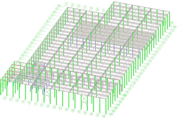 Выполнены расчеты конструкций зданий части объектов завода. Выполнены чертежи для стадий П и Р главного корпуса, АБК и нескольких вспомогательных зданий.