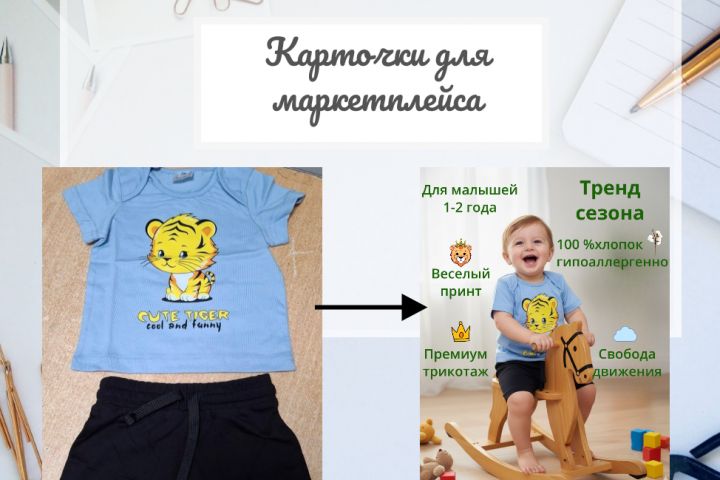У заказчика были фото детского костюма. Необходимо было сделать продающие карточки для маркетплейса.