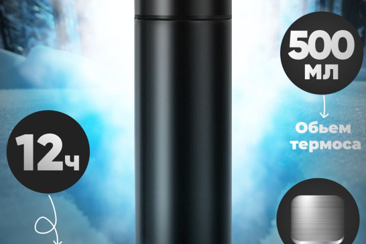 Для данной карточки товара я сгенерировал фон на котором будет изображен зимний лес. Чтобы подчеркнуть факт что термос не теряет температуру в зимнюю погоду я добавил пар, который исходит от термоса. Так-же я подчеркнул основные характеристики товара. Данная работа была выполнена в Figma