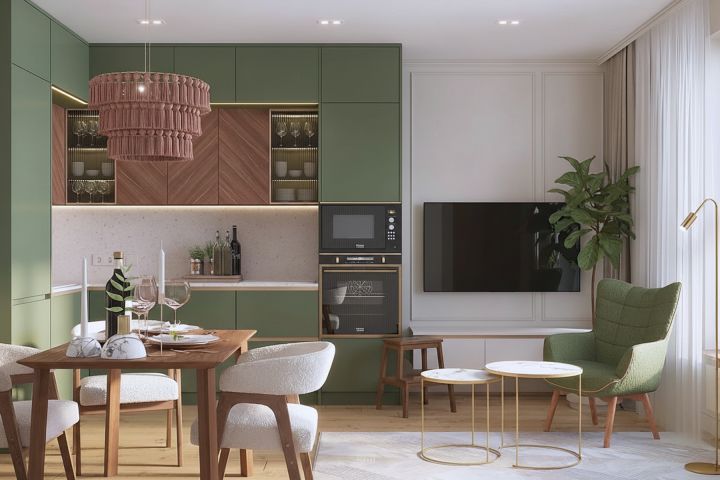 Зато по цветовым предпочтениям у пары разногласий не было — любимые цвета в отделке — приглушенный оливковый и теплое медовое дерево на общем спокойном нежно-сливочном тоне. В качестве акцентов можно использовать немного пудрового розового.