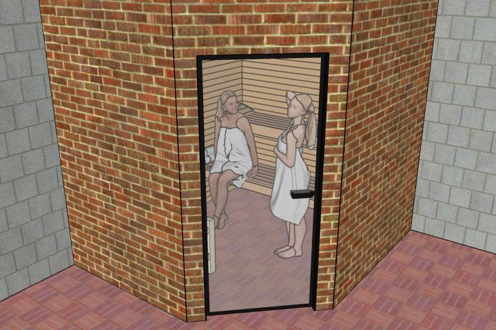 На основе проекта был составлен план угла здания, где должна была располагаться сауна. Сделана сцена с готовой действующей сауной.