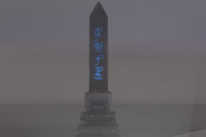Создать детализированную 3D-модель монументального объекта в стиле фэнтези, сочетающую реалистичную текстуру камня и элементы мистики (светящиеся руны)